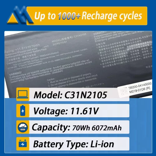 • ?Tech Specs & 100% New Products? Model: C31N2105 Voltage:11.61V Capacity:5895mAh/70Wh Battery type: Li-ion. (We only use grade A battery cells that provide up to 500 recharge cycles over the life of the battery. Come with screwdrivers.)