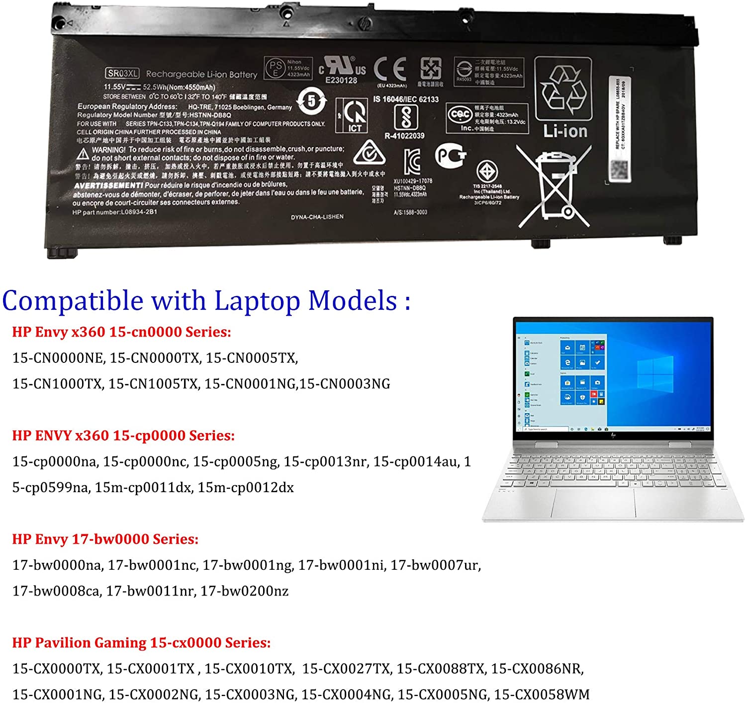 SR03XL Battery for Hp Pavilion 15-cx0000 HSTNN-DB8Q L08934-2B1 SR03052XL HSTNN-DB8Q